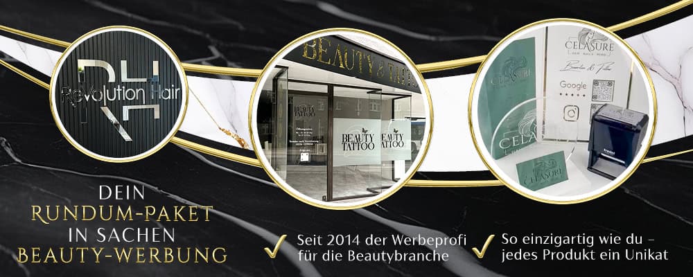 Du hast für deinen Salon bereits eine funktionierende Marketingstrategie: deine Corporate Identity findet sich auf deinen Kundenhandouts und findet sich beispielweise bereits als Acrylbild, Logoschild oder Wandbild innerhalb deines Studios. Du hast bei uns bereits dein Logo Branding erstellen lassen. Aber was ist mit deinem Werbeauftritt nach draußen? Du hast ein Schaufenster, welches du praktisch, nobel und schick als Werbefläche nutzen möchtest? Wir bieten dir deine individuelle Schaufensterbeschriftung! Auf hochwertiger Markenfolie findest du dein Branding in Metallic Hochglanz Gold- oder Silberfarben. Auch Fensteraufkleber erstellen wir nach deinen persönlichen Vorlagen und im Rahmen deiner Corporate Identity. Fensteraufkleber haben viele Abnehmer, du suchst jedoch nach etwas Besonderem, was den Flair deines Studios nach Außen transportiert? Kein Problem für den BeautywerbeProfi! Mit unseren Satin-Dekorbannern zeichnest du dich von der Masse ab! Die extrem hochwertigen, lichtdurchlässigen Werbebanner funktionieren sogar als Leuchtreklame, wenn du eine Lampe im Inneren deines Studios aufstellst. Tagsüber schick und edel, abends eine wahnsinnige Leuchtreklame. Schlage zwei Fliegen mit einer Klappe und kontaktiere uns gerne!
