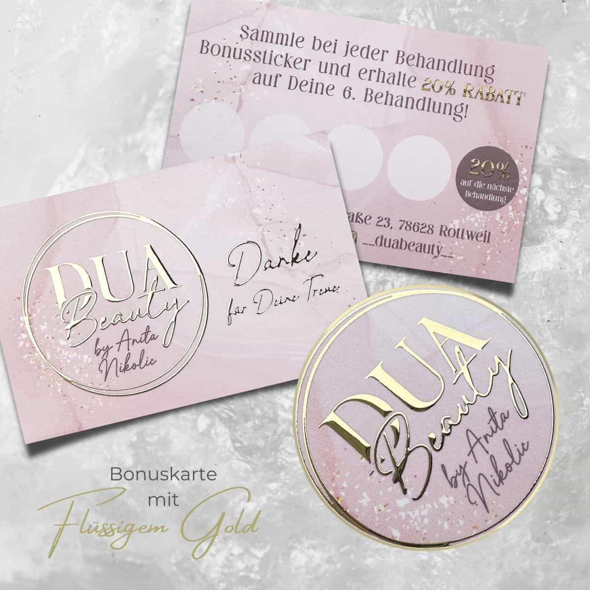Die Bonuskarte in der Größe einer Visitenkarte wird auf der Vorderseite mit deinem individuellen Logo oder Schriftzug und hinten mit deinen Wunschdaten komplett für dich personalisiert.