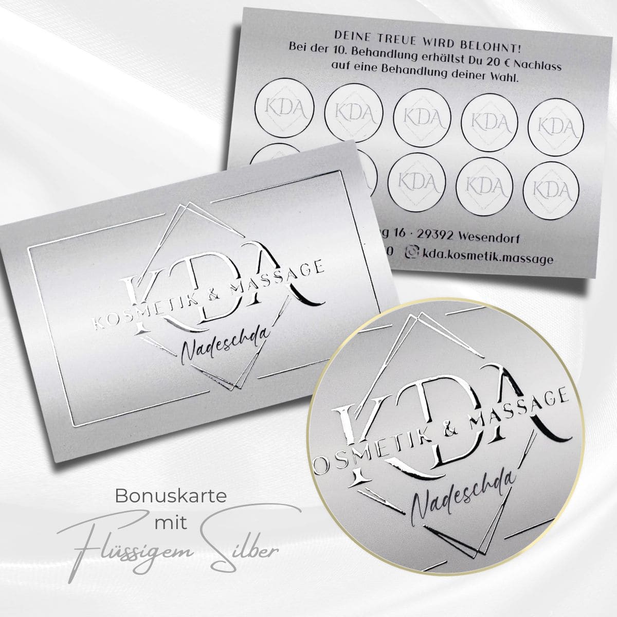 Damit sich deine Kundin oder dein Kunde einen kleinen Benefit verdienen kann bieten wir dir im exklusiven und eleganten Design unsere edlen Bonuskarten mit Silber oder Gold Veredelung an.