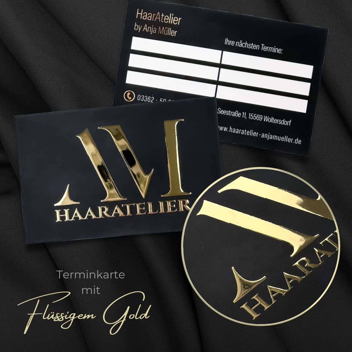 Auf der Rückseite befindet sich Platz für die nächsten X Termine bei dir. Freue dich auf deinen neuen, eleganten und exklusiven Terminkarten Gold Veredelung oder Silberlack.