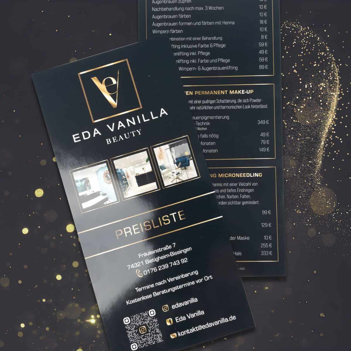 Verteile potentiellen Neukunden dieses exklusive Faltblatt mit flüssiger Gold- oder flüssiger Silber-Veredelung und mache sie bereits mit diesem edlen Handout glücklich. Ob es sich bei dir um einen 4-Seiter Flyer für Kosmetik, deine PMU Behandlungen, die Pediküre, die Zahnaufhellung oder andere Beautyanwendungen handelt, deine Kunden werden von dem individuellen Design und der erstklassigen Qualität schon direkt begeistert sein.