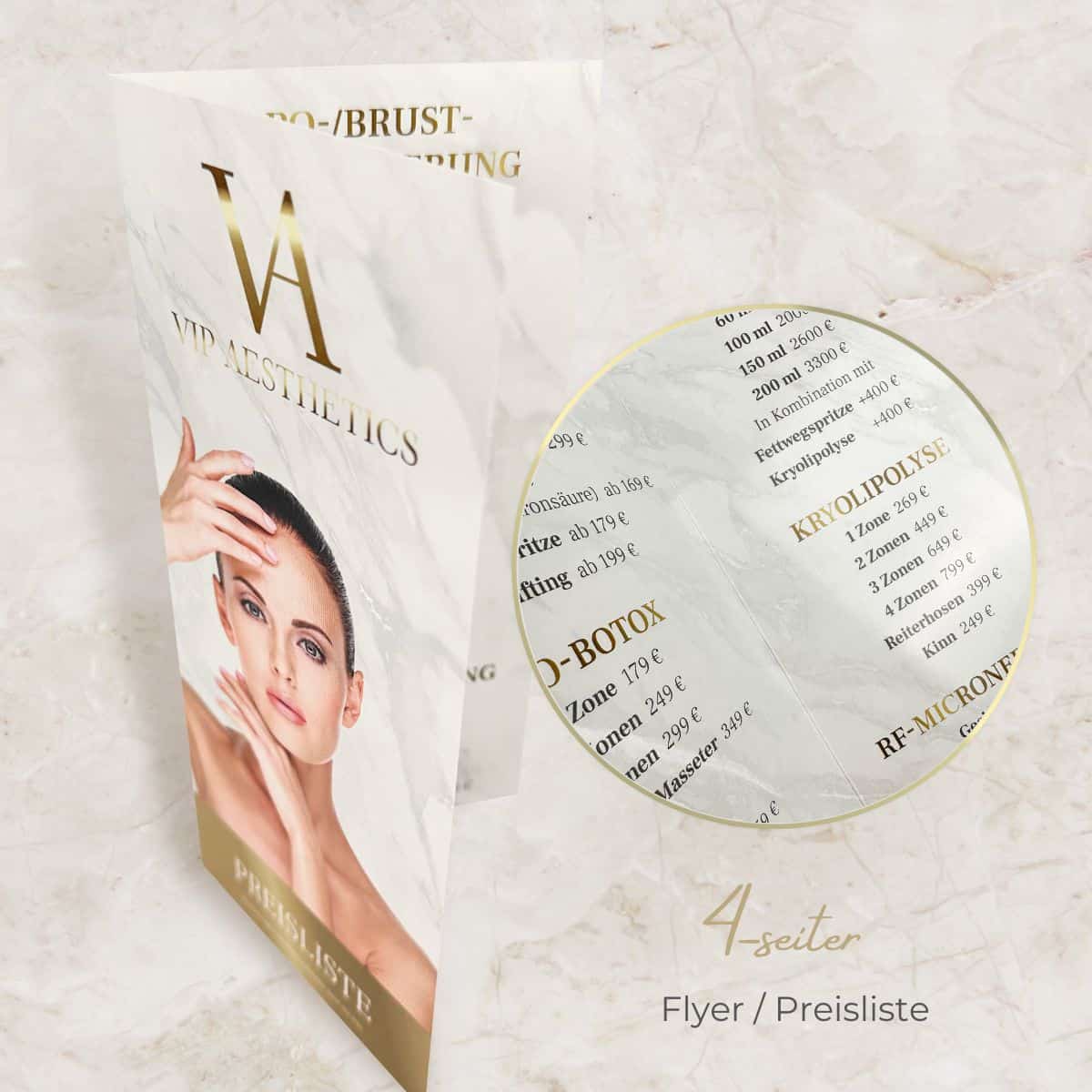 Verteile potentiellen Neukunden dieses exklusive Faltblatt mit flüssiger Gold- oder flüssiger Silber-Veredelung und mache sie bereits mit diesem edlen Handout glücklich. Ob es sich bei dir um einen 6-Seiter Flyer für Kosmetik, deine PMU Behandlungen, die Pediküre, die Zahnaufhellung oder andere Beautyanwendungen handelt, deine Kunden werden von dem individuellen Design und der erstklassigen Qualität schon direkt begeistert sein.