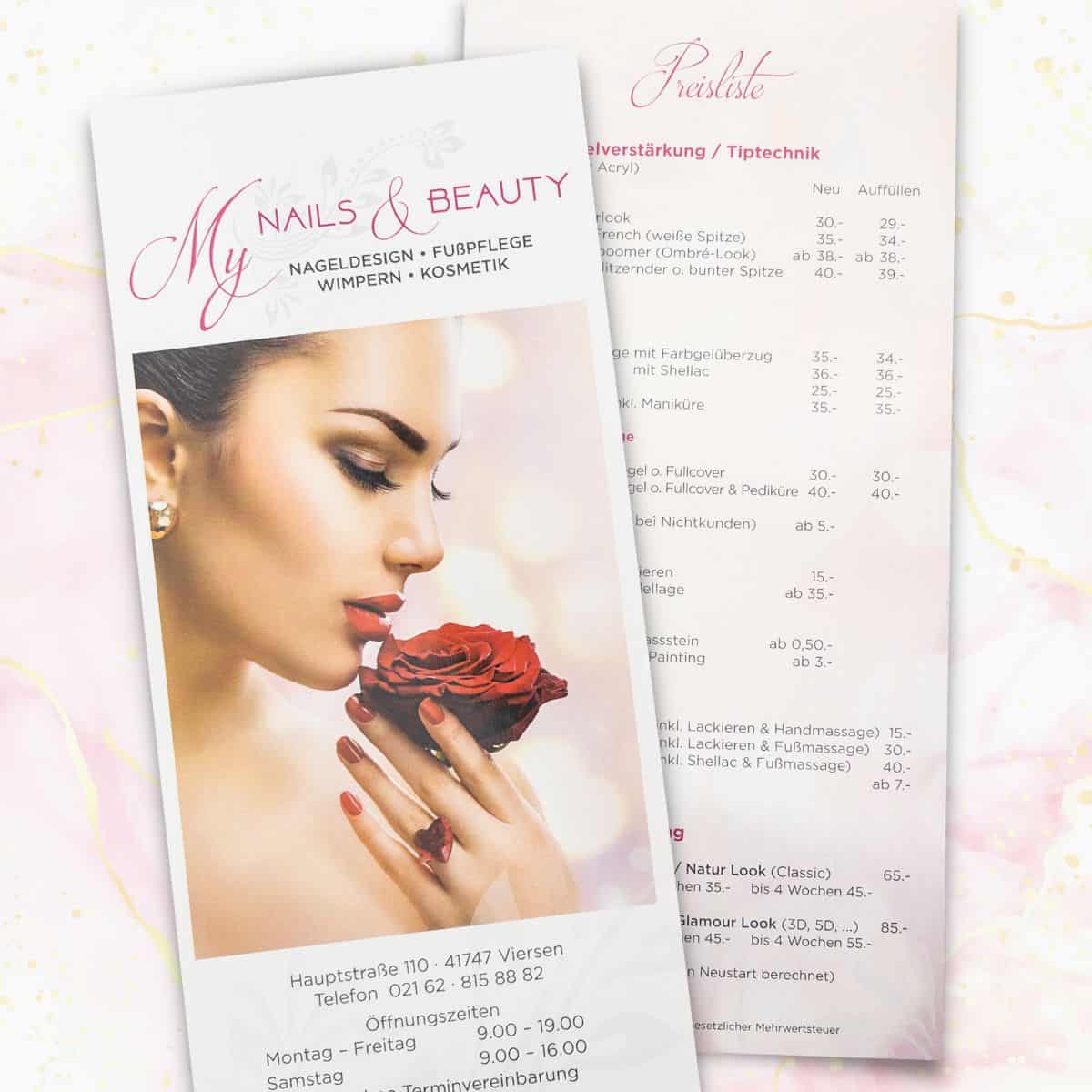 Deine Welt ist die Beautybranche und Glanz und Glamour stehen für dich als Zeichen für ein erfolgreich geführtes Hautberatungsstudio. Deine Nagelstudiokunden schwärmen von deiner Arbeit und werden diesen exklusiven Hochglanzflyer gerne an Freunde und Bekannte weiterreichen.