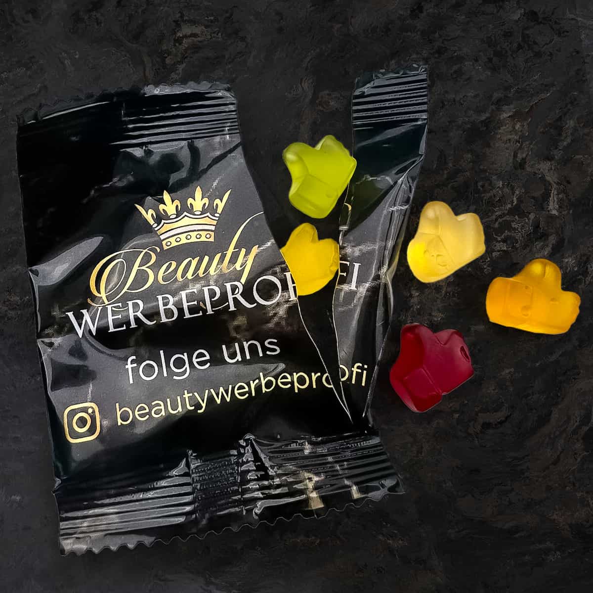 Diese Tütchen, gefüllt mit leckerem Fruchtgummi, also Gummibärchen in verschiedenen Geschmacksrichtungen, sind gestaltet in deinem Wunschdesign – mit deinem Logo. Vorder und Rückseite werden bedruckt – wobei sich auf der Rückseite die gesetzlichen Infos befinden und vorne dein Logo glänzen kann.