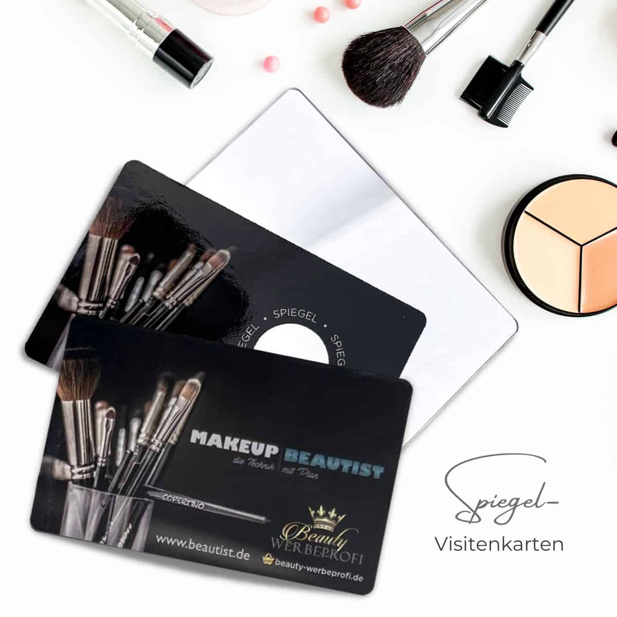 Mit unseren hochwertigen Spiegel-Visitenkarten setzt du besondere Akzente, denn gleichzeitig sind unsere extravaganten Visitenkarten der Kosmetikspiegel für deine Handtasche.