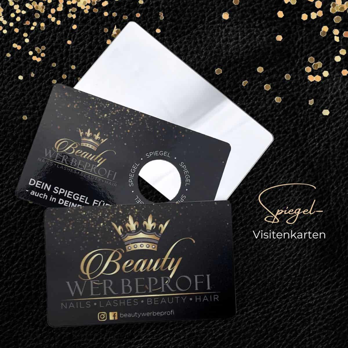 Du bist in der Beautybranche zu Hause und dein Herz schlägt für Glanz und Glamour. Dann bist du mit deinem Nagelstudio oder Kosmetiksalon bei uns genau richtig. Wir erstellen mit dir gemeinsam extravagante Visitenkarten für Friseure oder Lashliftingstudios in deinem persönlichen Style. Deine extra für dich designten Spiegel-Visitenkarten werden besonders geschützt geliefert.
