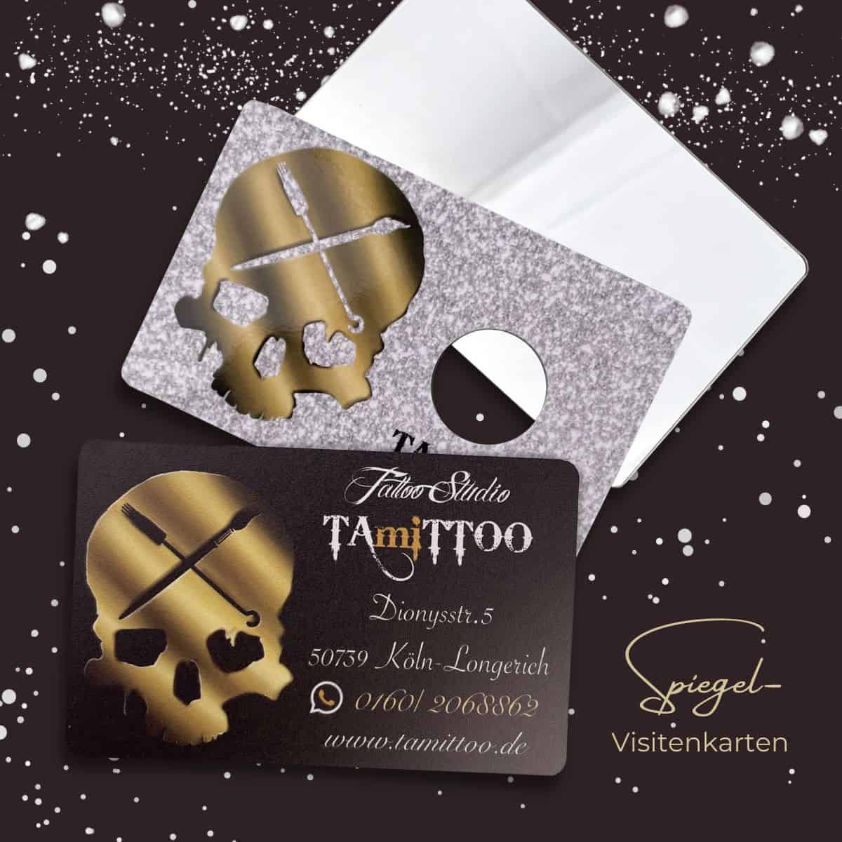 Jede Karte kommt einzeln verpackt im Kunststofftütchen- zusätzlich gibt es in der Tüte eine Karte aus Papier in deinem Design und eine Folie welche die Spiegeloberfläche schützt. Somit sind die Karten für dein Kosmetikstudio oder Hautberatungsstudio besonders langlebig. Gönne auch dir etwas Besonderes und sende den Glanz deines Tattoostudios mit der exklusiven Spiegel-Visitenkarte in die Welt hinaus.