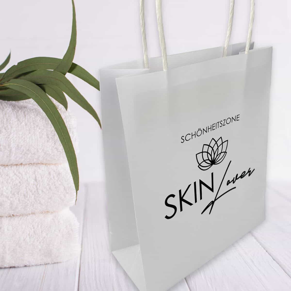 Steigere deine Bekanntheit und lass dein Logo oder deinen individuellen Schriftzug noch besser zur Marke werden. Durch die Kombination der Farben schwarz und weiß ist ein elegantes Aussehen gewährleistet und man erkennt das Logo auch auf eine gewisse Entfernung. Freue dich, wenn deine Kunden ihre Kosmetikartikel oder ihr Wimpernzubehör stolz in deiner personalisierten Papiertragetasche Heim bringen.