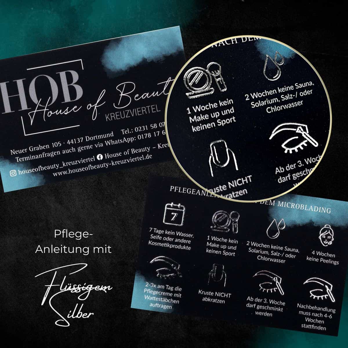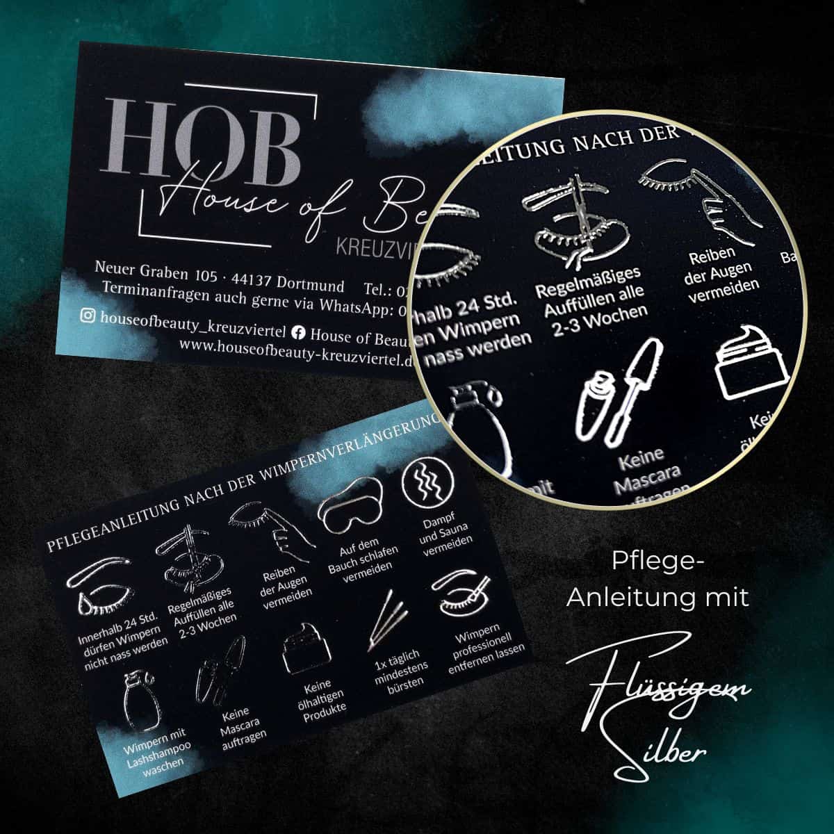 Diese Visitenkarte, veredelt mit flüssigem Gold oder Silber, sieht nicht nur glamourös aus, man fühlt sogar durch die Softtouch-Oberfläche die Exklusivität dieser Pflegeanleitung nach erfolgreicher Wimpernverlängerung.