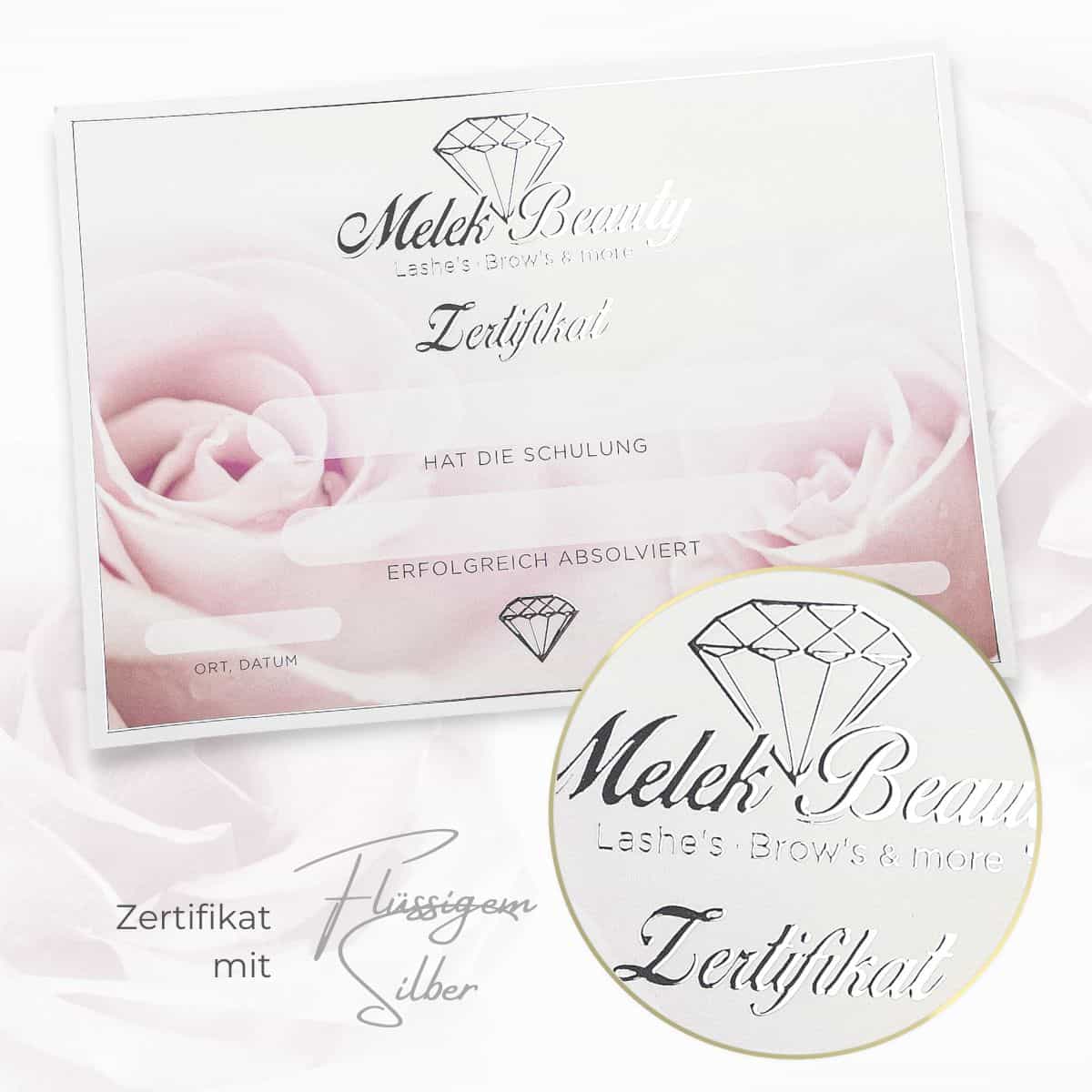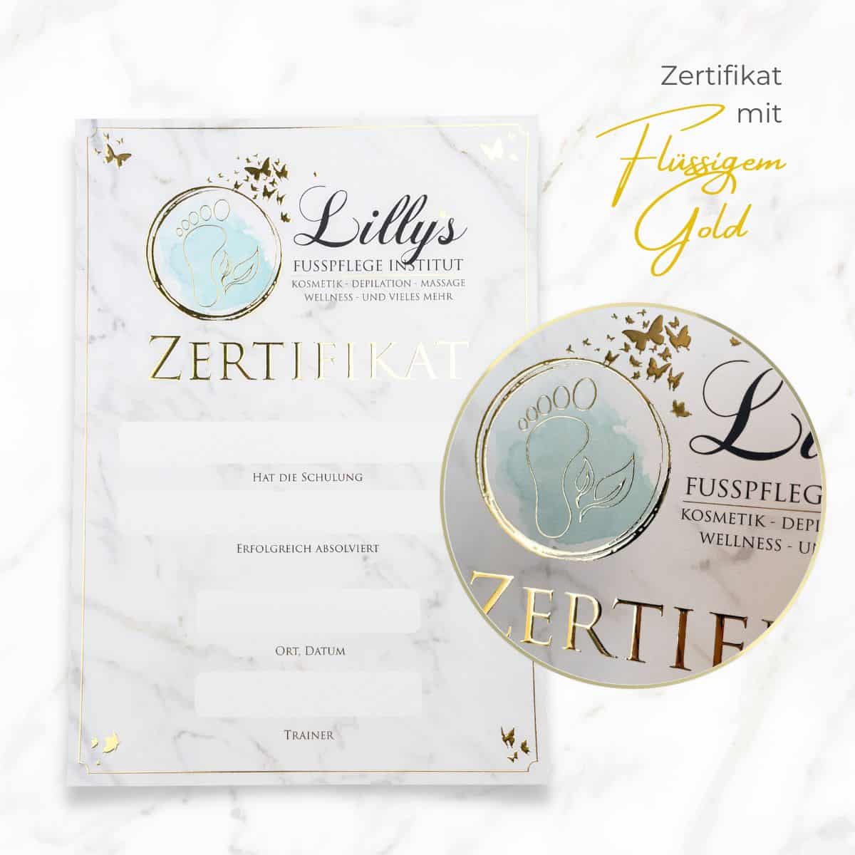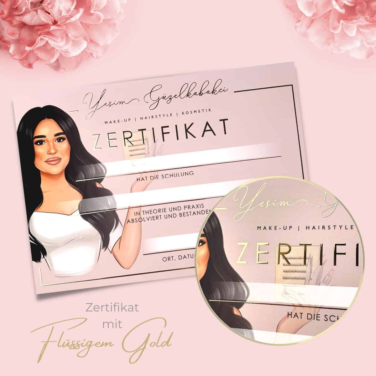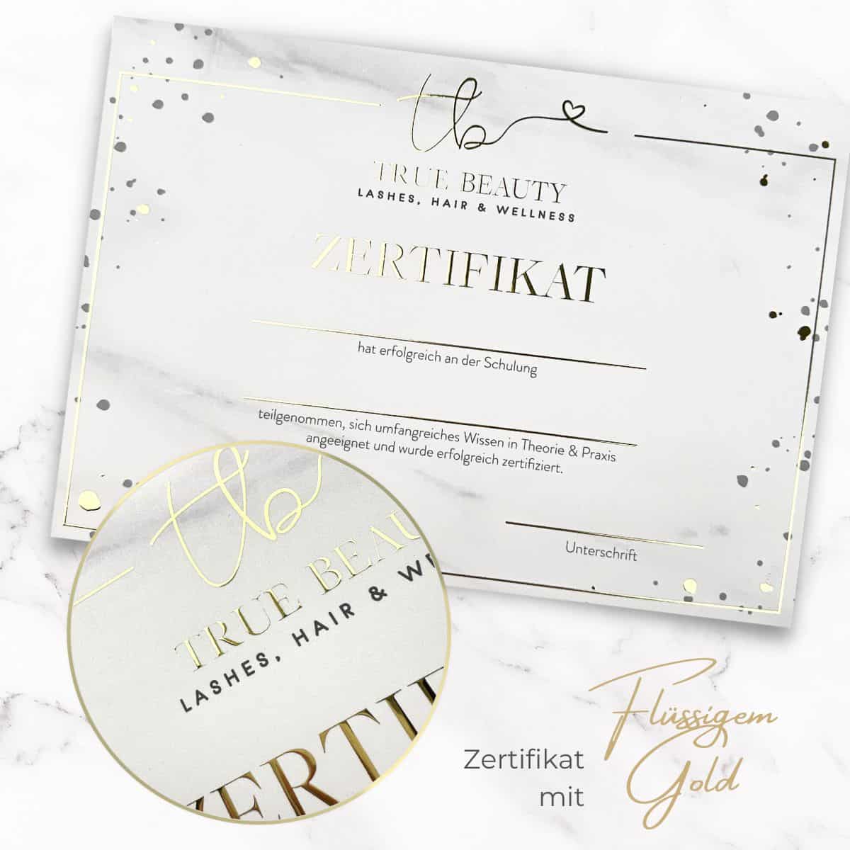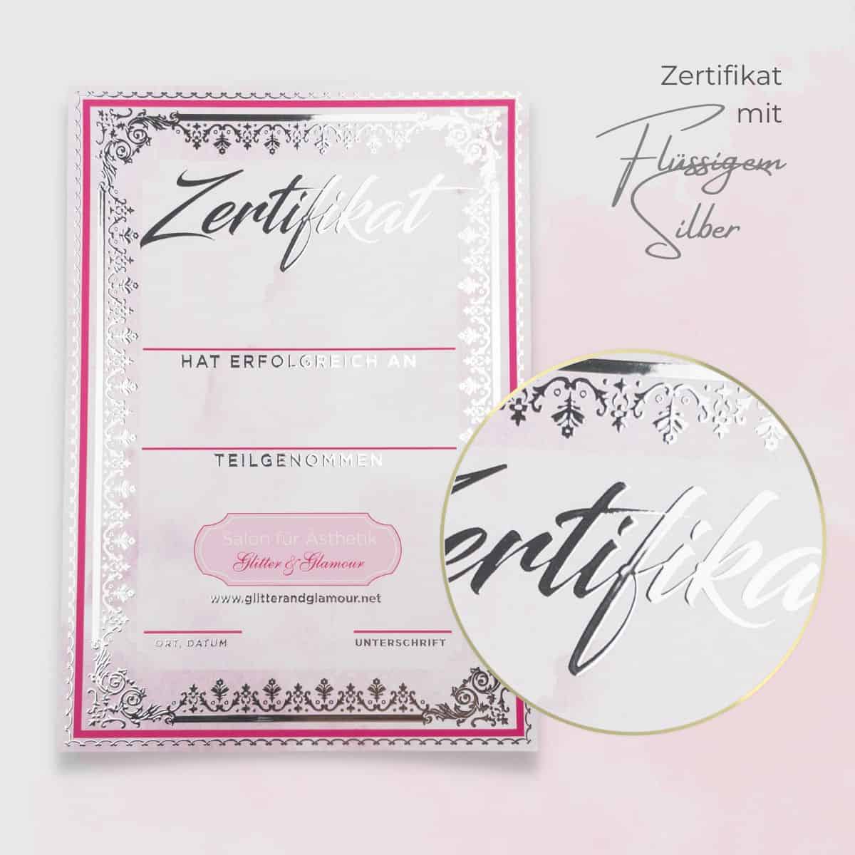 Wir empfehlen dir die Beschriftung deines Zertifikates mit der Hand. Gepaart mit deiner einzigartigen Handschrift und deinem individuellen Beautylogo entsteht ein einmaliges, glamouröses Zertifikat. Solltest du dich für das Drucken der Teilnehmerdaten entscheiden wollen, beachte bitte, dass es sich um einen Laserdrucker handeln muss, der mindestens 300gr starkes Papier einziehen können muss.