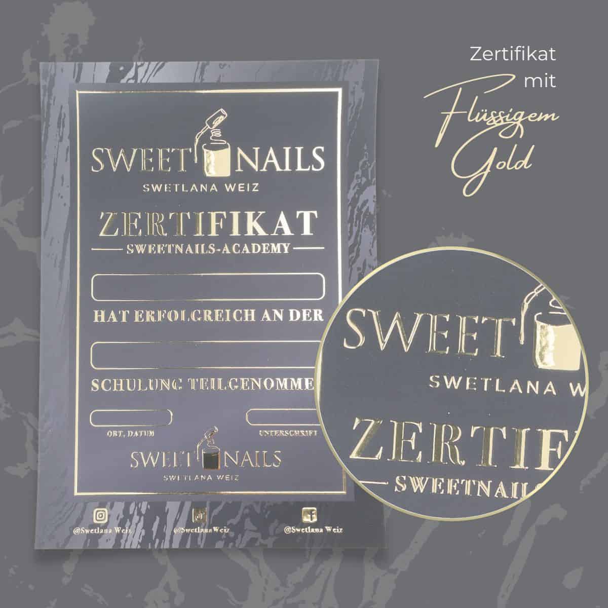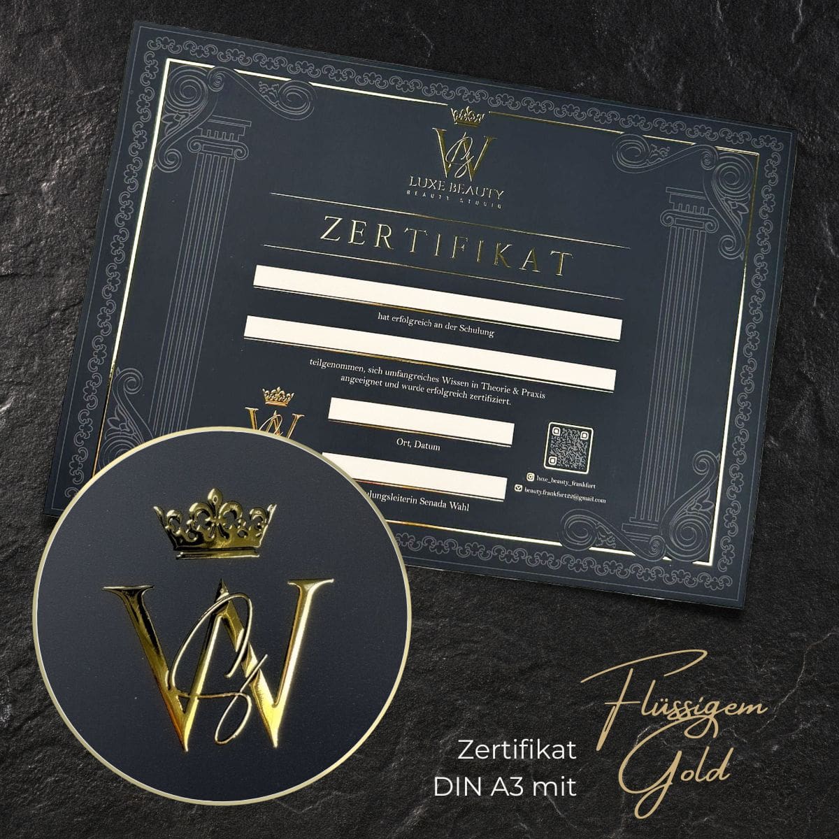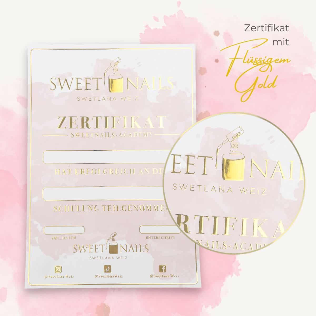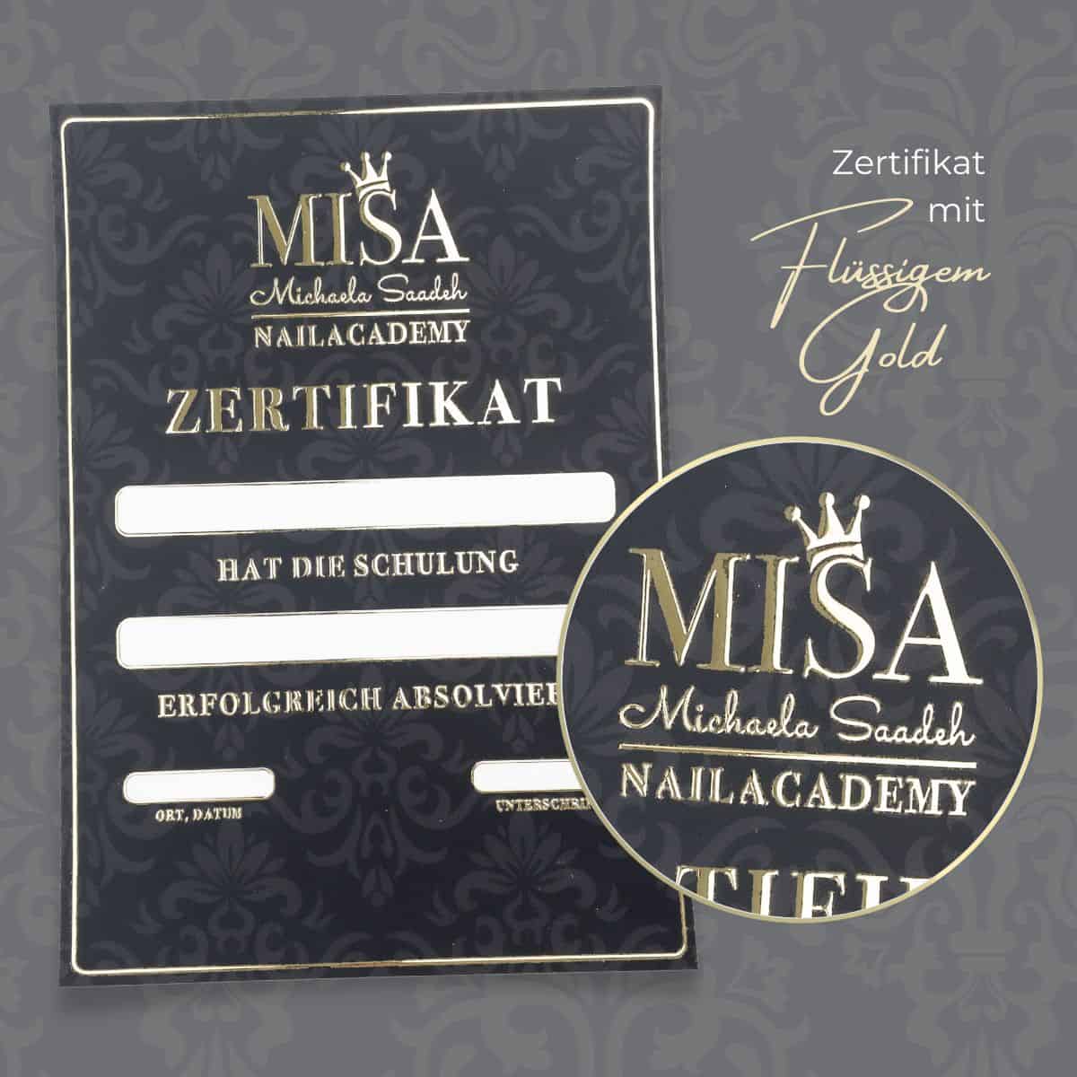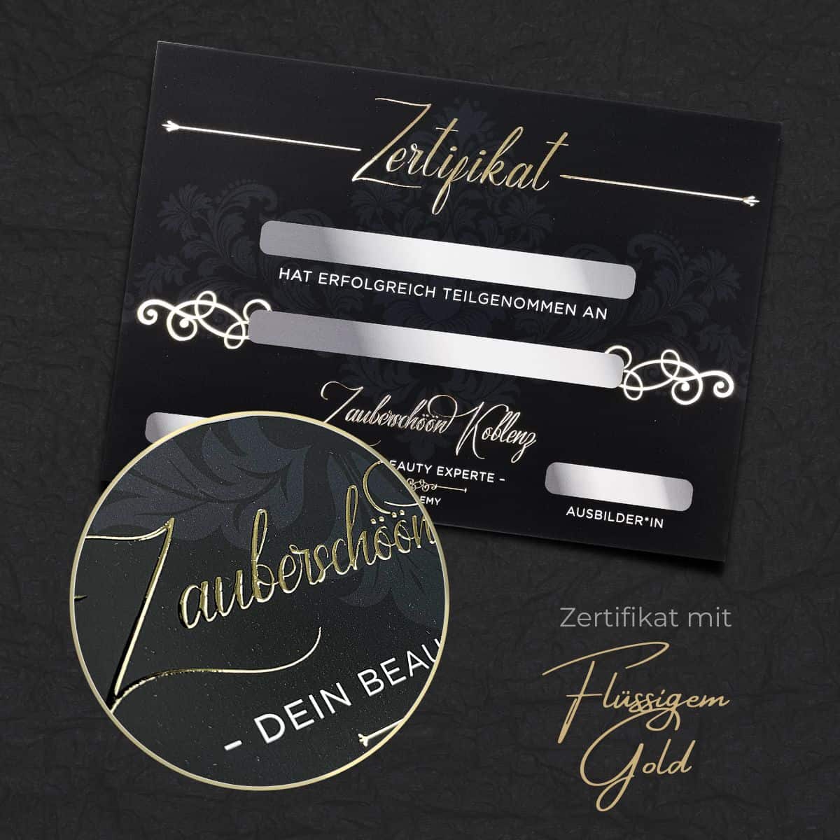 Wir empfehlen dir die Beschriftung deines Zertifikates mit der Hand. Gepaart mit deiner einzigartigen Handschrift und deinem individuellen Beautylogo entsteht ein einmaliges, glamouröses Zertifikat. Solltest du dich für das Drucken der Teilnehmerdaten entscheiden wollen, beachte bitte, dass es sich um einen Laserdrucker handeln muss, der mindestens 300gr starkes Papier einziehen können muss.